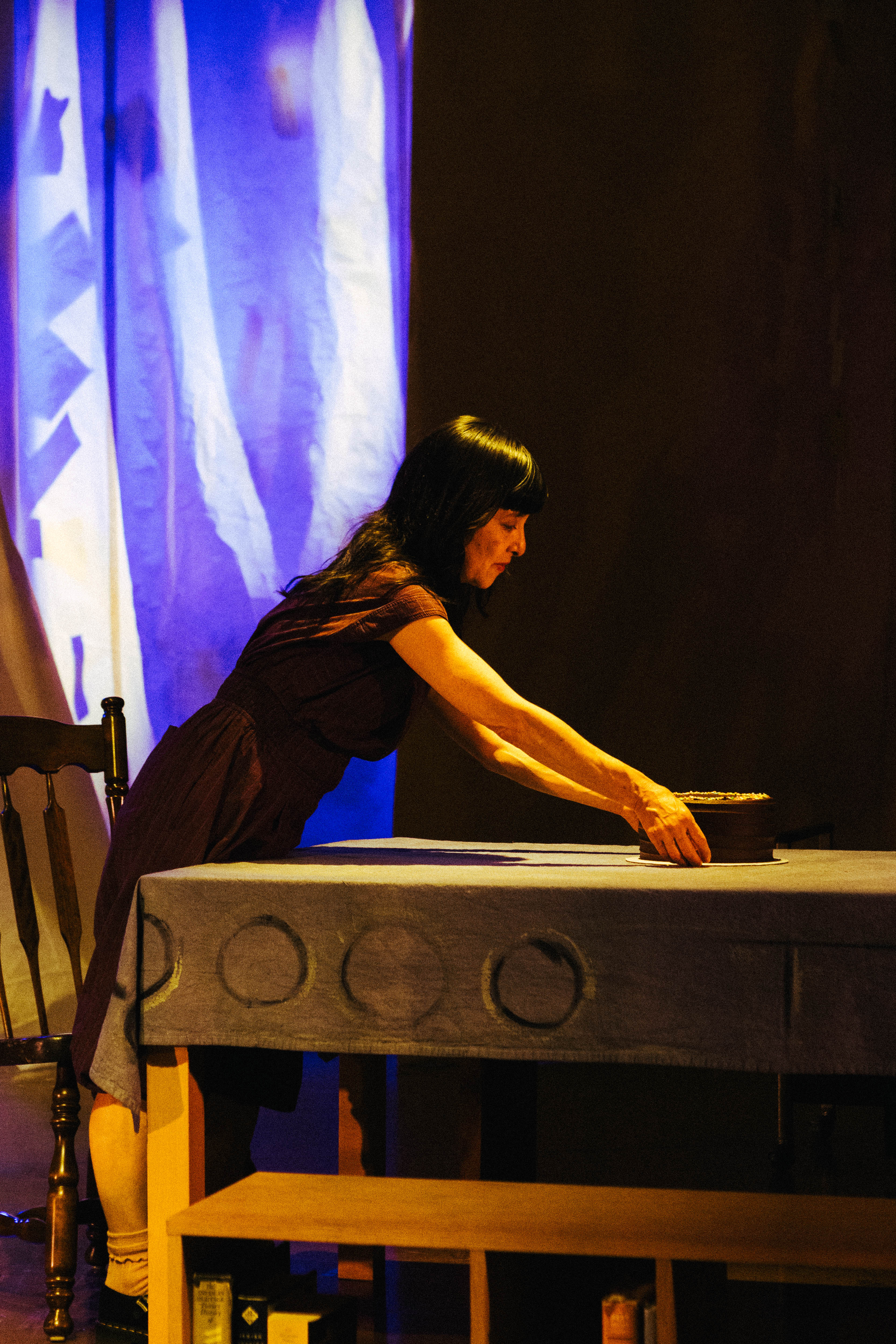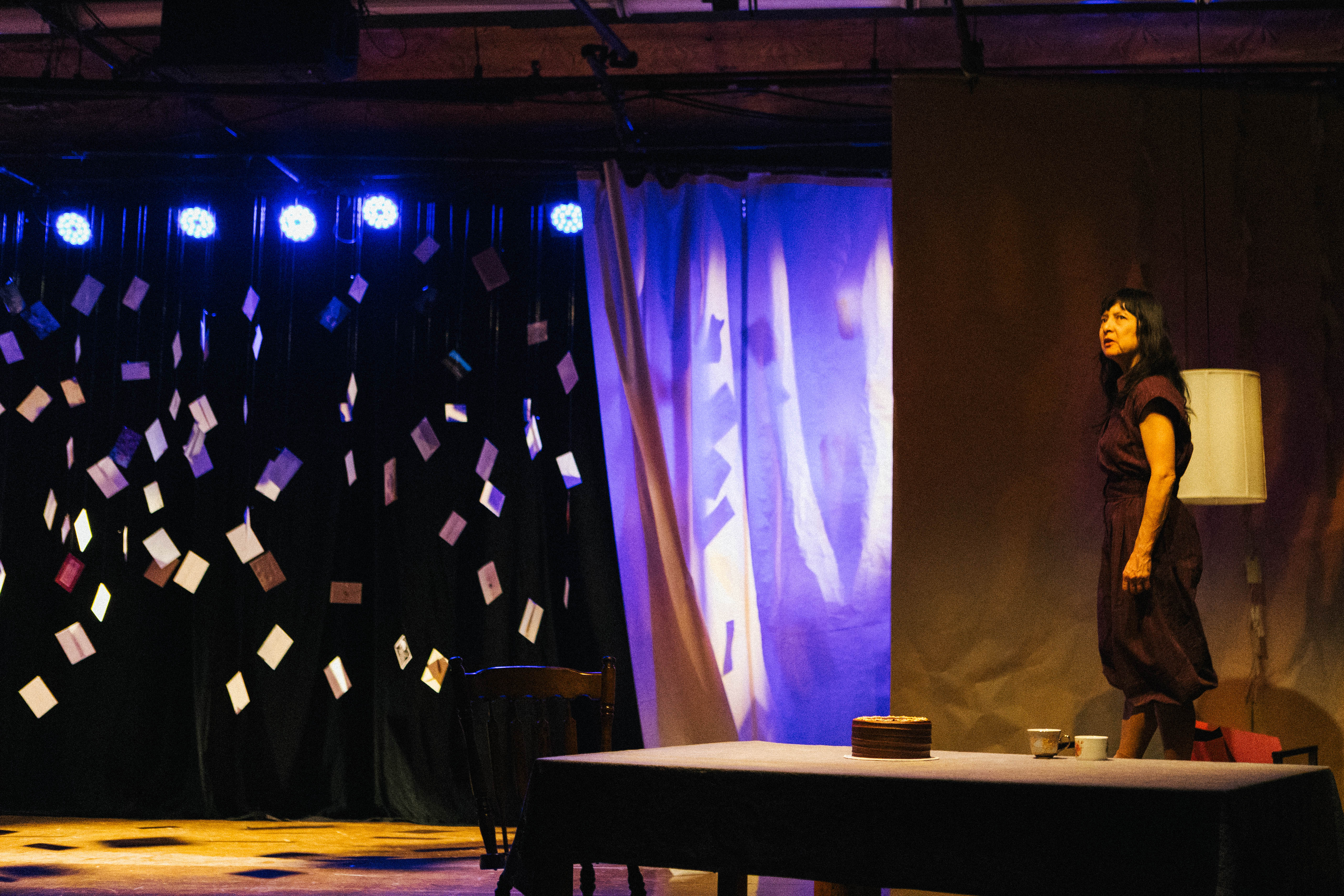 Collaboratively-created scenery for the premier of an original one-woman show written and performed by Kim Ima. Most of the assembled objects onstage are gathered from Kim’s family collections. A rug hand-painted with images from family artworks, childhood drawings, and other ephemera grounds the space.