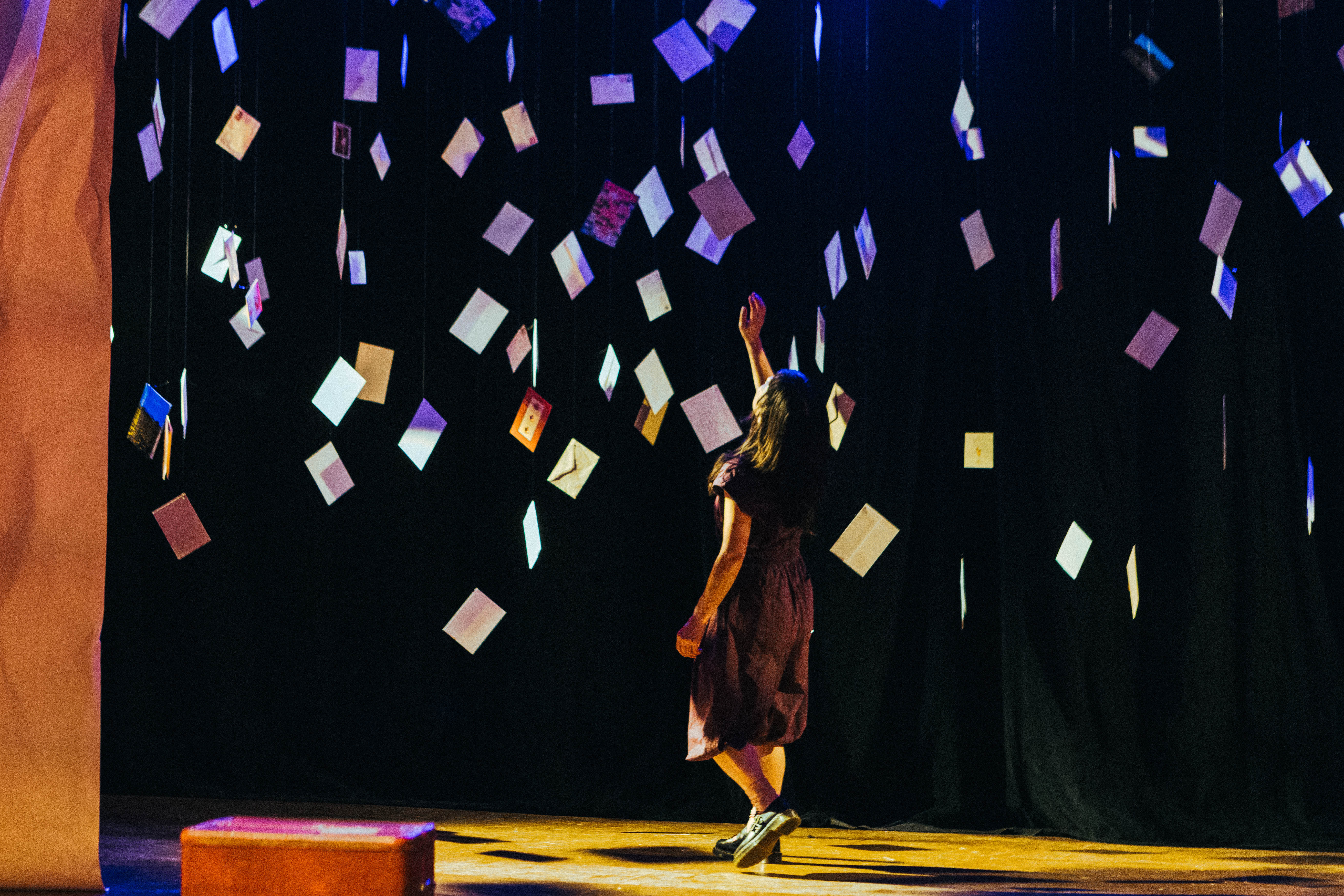 Scenery built from found materials with interactive rolls of paper, drawings that changed throughout the show, and small sculptures.